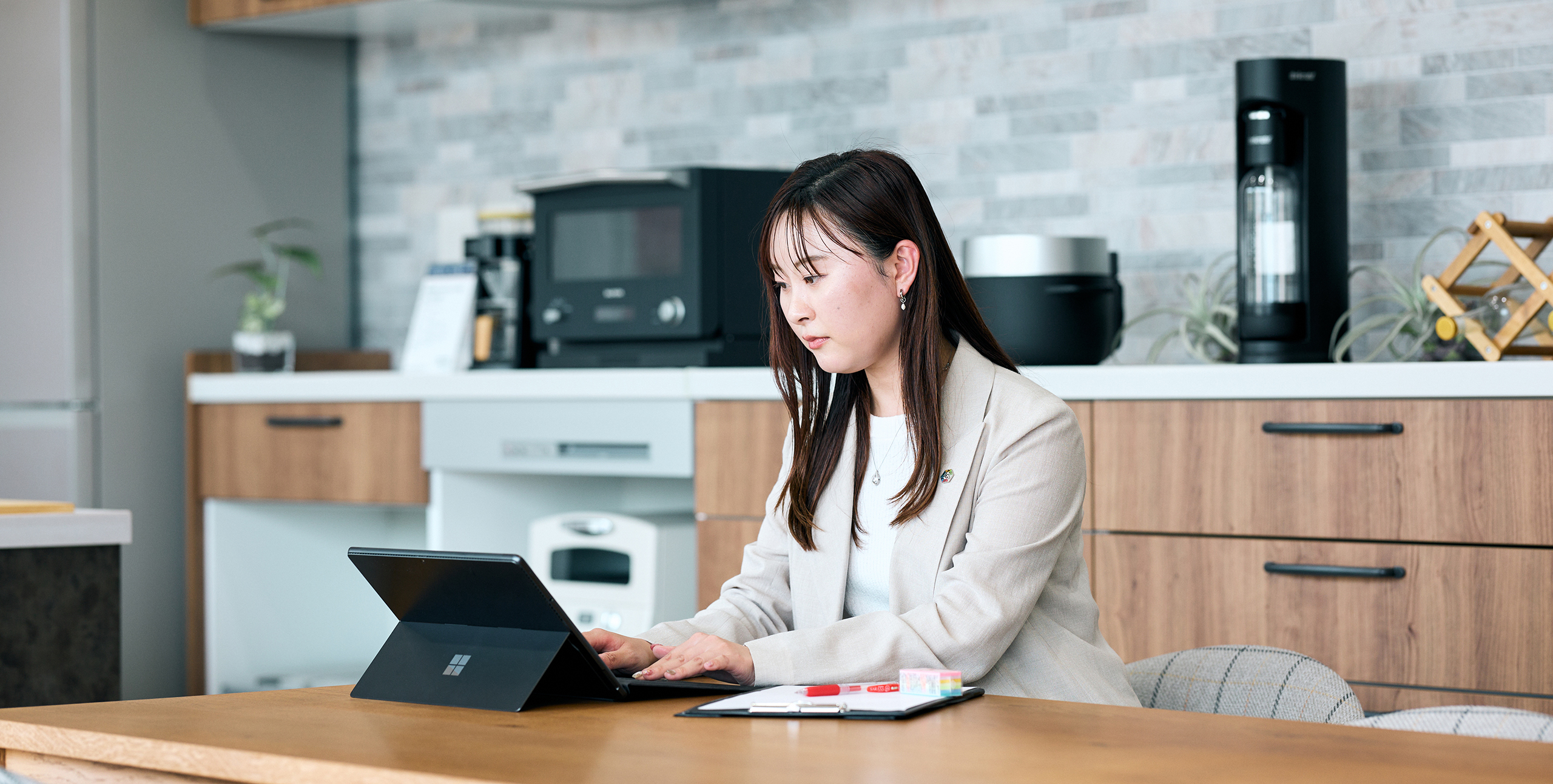 分譲住宅の新商品などをプランニングし、CADソフトを使ってプランの作図や図面制作などをしています。新商品や仕様が変わった際には、イメージ図やパースを作り、社内で共有するためのプレゼン資料も作成します。さらに、社内から依頼があれば、商業施設や現地に置くポスターやイベント用のチラシ、パンフレットのデザインも担当することもあります。この前、リニューアルした店舗に自分がデザインしたイメージパネルが置かれることになったので見に行ったのですが、自分が作った図面やデザインが実際に形になっているのを目の当たりにすると、やっぱりとても嬉しかったです!