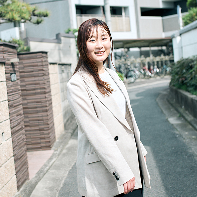 入社後、生産管理本部 近畿工事統轄部 鳳営業所に配属。堺営業所への異動を経て、2021年10月から生産管理本部 設計部 商品企画課でキャリアを積む。